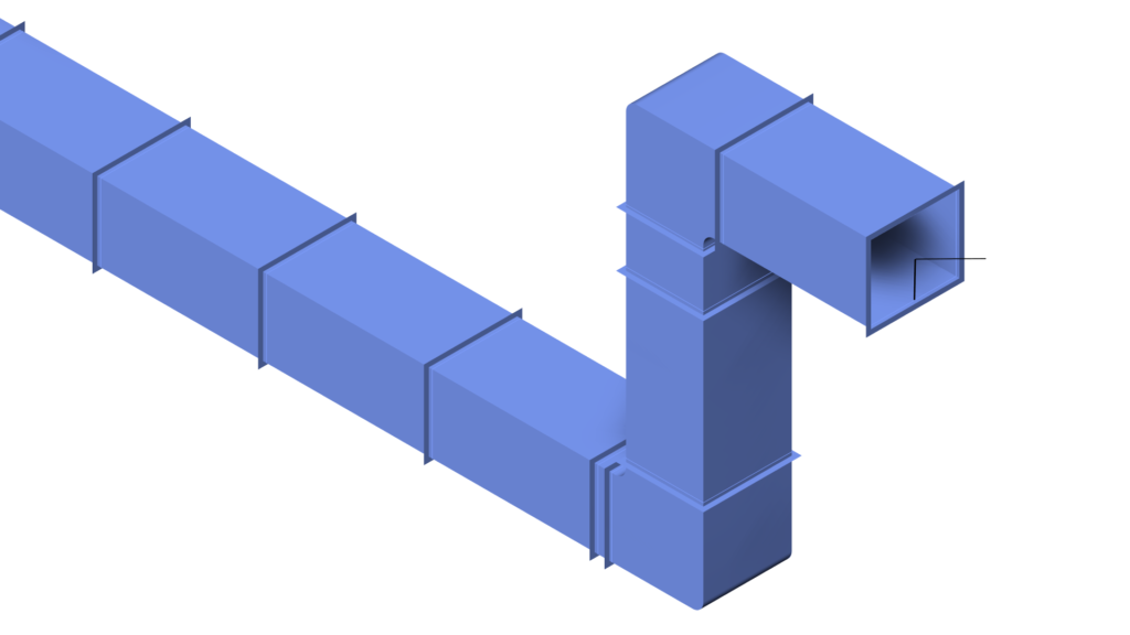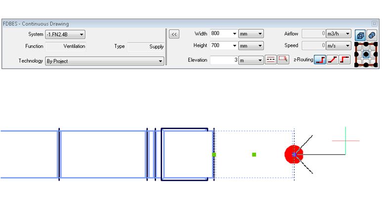 Draw ducts turn-by-turn, specifying points on the drawing. While tracing the duct path, you can change the cross-section dimensions and elevation; when changing dimensions or switching between rectangular and circular shapes, the program automatically selects and inserts the appropriate reducing or transition adapters.