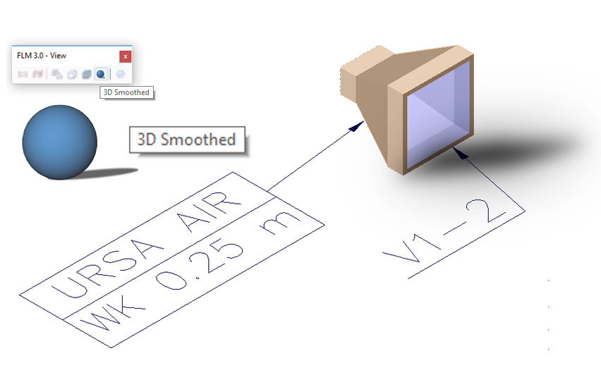 Elements and devices in the FLM libraries can be presented in various ways – both in 2D and 3D. The different available views allow visualization of the designed systems and enable detection of collisions between critical parts of the project such as ducts, ceilings, central plants, etc. Also available are the 2D HLR and 3D HLR views that were introduced in order to optimize the display of drawings for printing.
