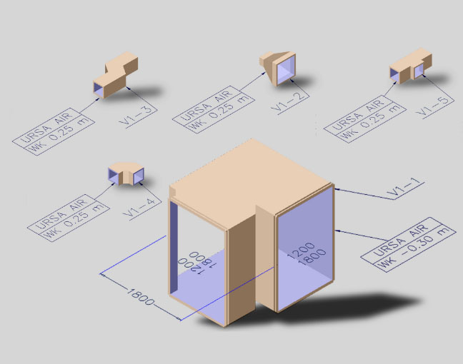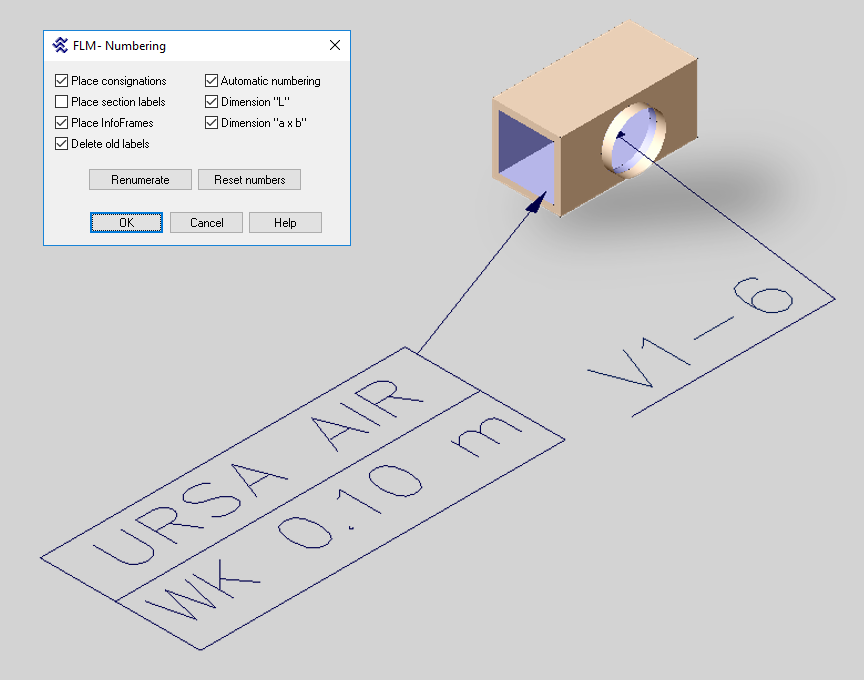 Each element placed using FLM can be annotated by an information table and dimension labels. It is possible to include various parameters such as device size, elevation, the pressure difference that must be reduced on dampers and terminals, airflow velocity, manufacturer name and user remarks.