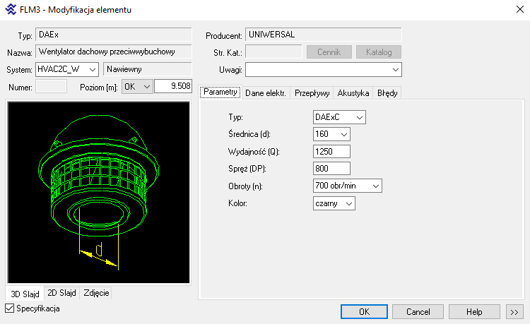 Przed wstawieniem elementu lub urządzenia na rysunek użytkownik modyfikuje jego parametry (wymiary, moc urządzenia, akcesoria itp.) wybierając je z listy rozwijanej bądź zaznaczając poszczególne opcje.