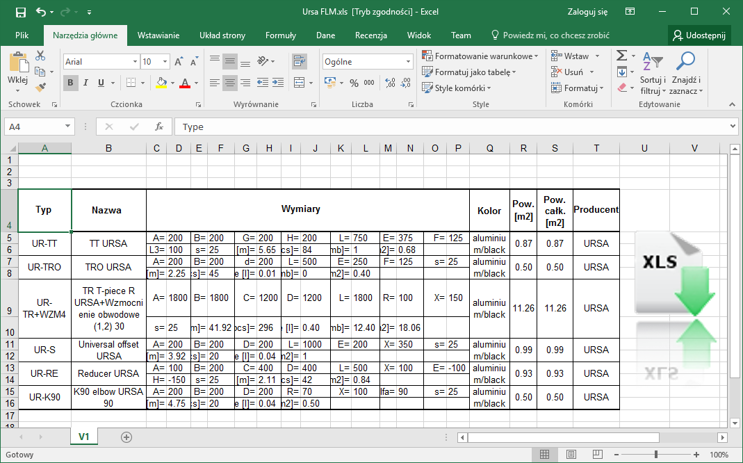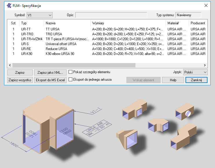 Zestawienie materiałów generowanie jest na podstawie elementów tworzących projekt znajdujących się w pliku *.dwg. Elementy o tej samej specyfikacji (parametrach) są grupowane dzięki czemu dokumenty zestawień materiałowych są bardziej przejrzyste. BOM tworzony jest dla każdego z systemów oddzielnie i może być zapisany w formacie *.xls oraz *.xml