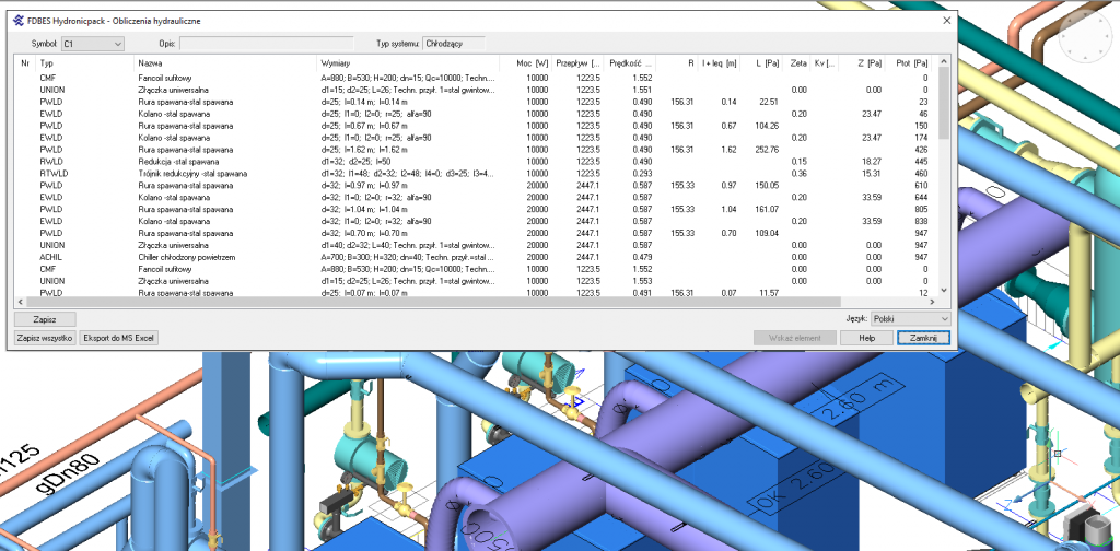 Po połączeniu wszystkich terminali i źródeł, wstawieniu armatury oraz włączeniu opcji „Automatyczny dobór średnic” program wykonuje pełne obliczenia hydrauliczne (dla podstawowych rozwiązań projektowych), dobiera średnice rurociągów, definiuje wielkości i nastawy zaworów regulacyjnych oraz równoważących.
