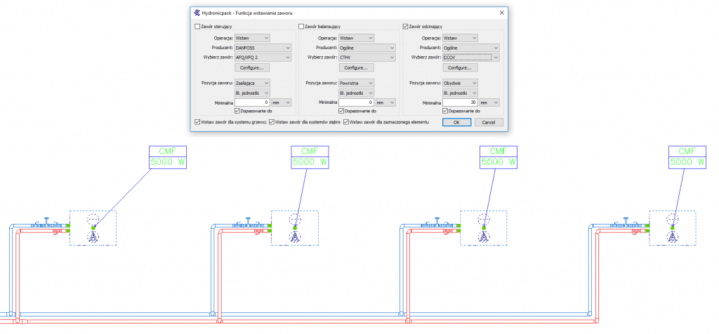 Zawory odcinające, regulacyjne lub równoważące terminali np. klimakonwektorów wentylatorowych – w przypadku których należy najpierw dokonać konfiguracji kryteriów doborowych, wstawione są automatyczne, co znacząco zwiększa efektywność projektowania.