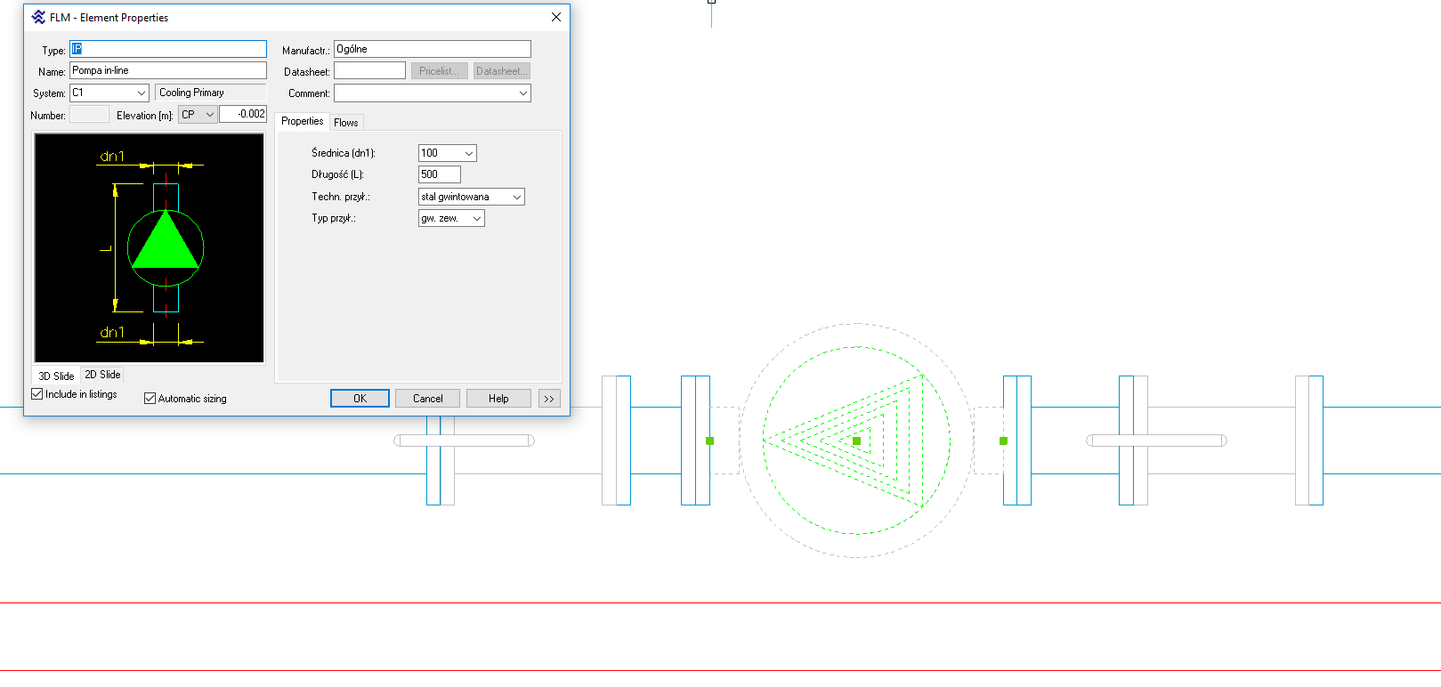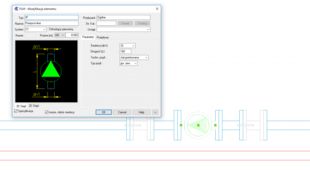 Po zaznaczeniu opcji „Automatyczny dobór średnicy” w oknie „Modyfikacji elementu” podczas wstawiania zaworów, pomp lub akcesoriów wybrane elementy zostaną odpowiednio dobrane zgodnie ze zmieniającymi się średnicami przewodów rurowych. Jeśli opcja ta nie zostanie zaznaczona do połączenia wybranych elementów z przewodami rurowymi wykorzystane zostaną, elementy redukcyjne i adaptery.